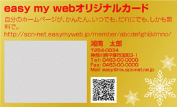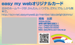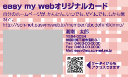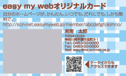 「my card」とは、easy my webで作ったホームページをより多くの人に見て貰えるように、名刺サイズのカードにホームページのタイトルやURL、さらには携帯で簡単にアクセスできるQRコードまで入れたオリジナルカードを印刷できるサービスです。